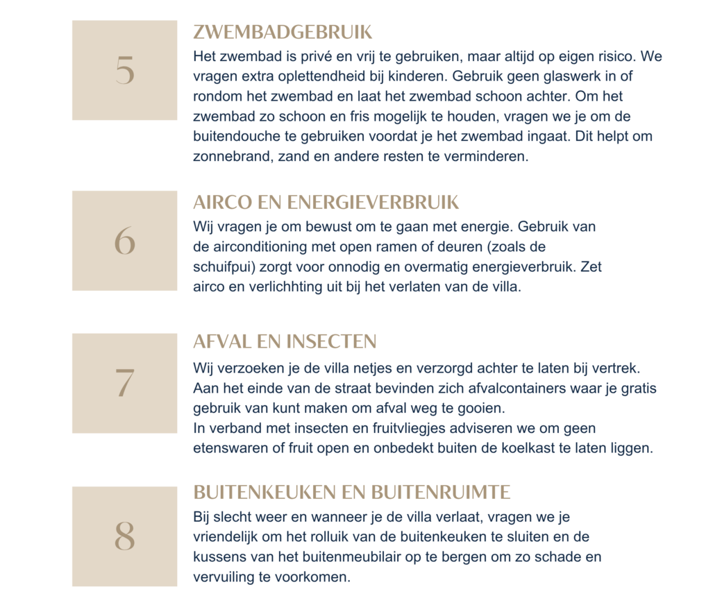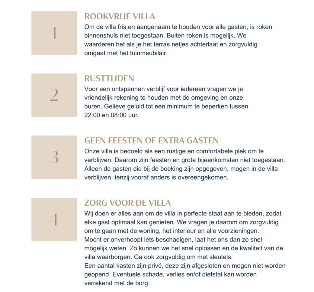 Wij hebben deze plek met veel zorg ingericht om jou een ontspannen en comfortabel verblijf te bieden. Met onderstaande huisregels zorgen we er samen voor dat iedereen optimaal kan genieten van de villa en de omgeving.