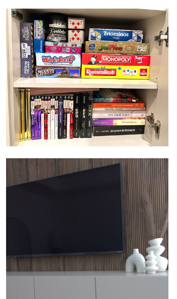 Een gevarieerde selectie spellen en boeken, met zorg samengesteld en regelmatig aangevuld tijdens onze eigen verblijven. Je kunt deze vinden in de tv-kast!